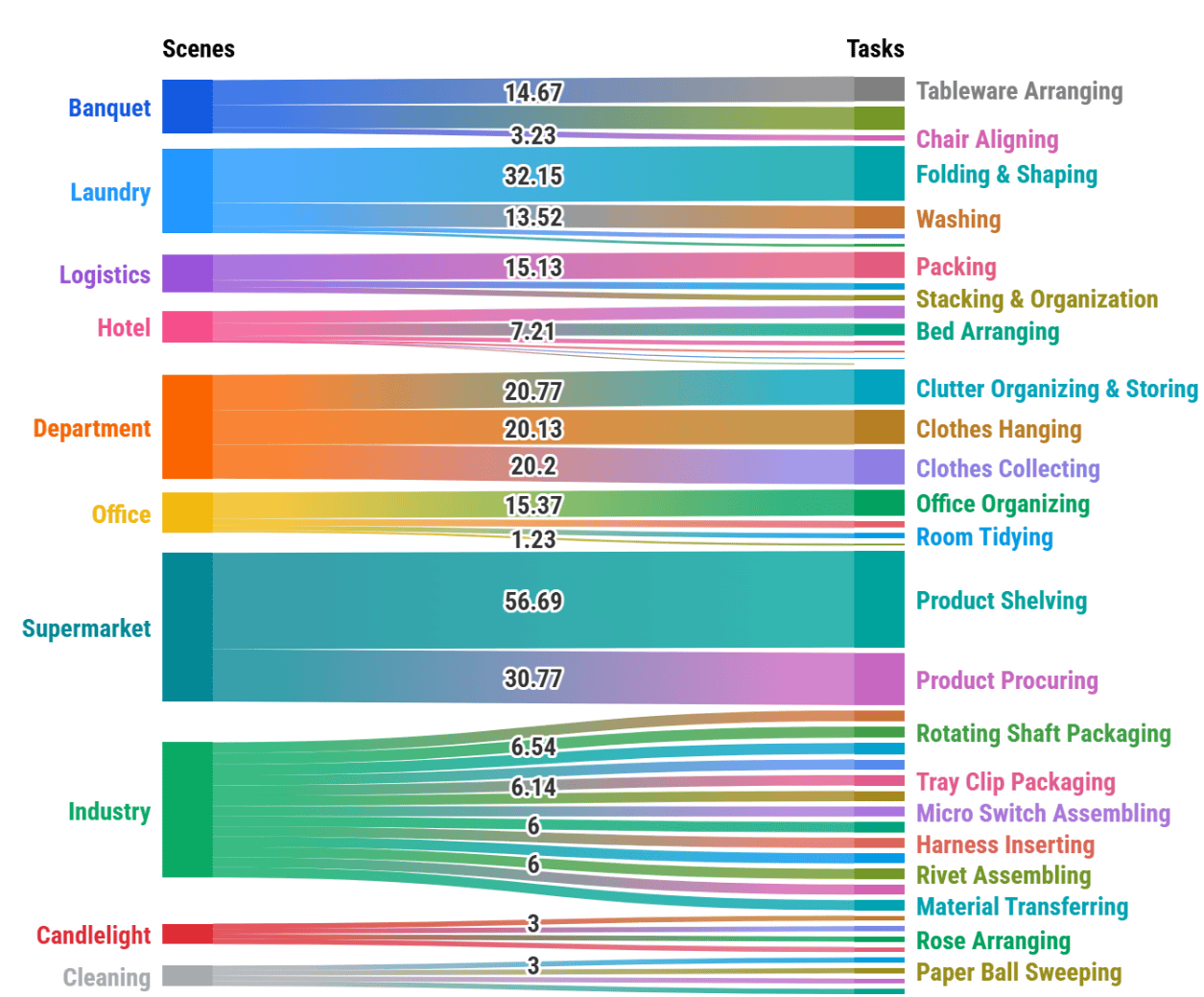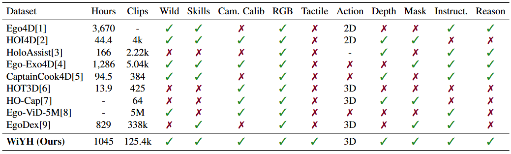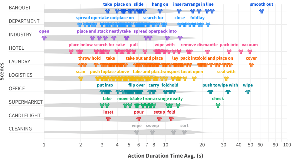 在 Human-centric 采集范式下形成的 WIYH 数据集,具备了真实可靠、丰富多元、全面多模态、规模化等特征,并拥有海量数据:包含超过10万条以上的真实人类操作视频、40余种任务类型、100多种人类技能,覆盖了含520 余种真实物品,真实还原商超、酒店、餐饮、工业、办公、家居等多行业的10种核心场景全链路任务,数据将分批次释放。WIYH是业内最大的Human-centric数据集,且仍在不断扩展和丰富中。