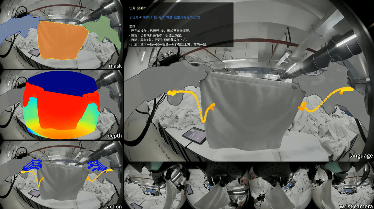 视觉语言标注:思考“为什么”。这是最关键的“大脑训练”,它通过空间明确指代操作对象,防止机器人在杂乱环境中错认目标。同时,让模型预测下一步任务,并设置逻辑陷阱来校验机器人的判断力。