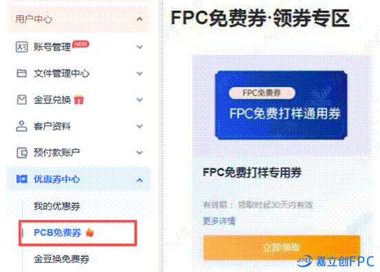 1、进入嘉立创FPC官网,点击【优惠活动】-【FPC免费打样】,进入活动页领券;