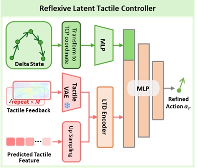 反射式触觉控制器(执行模块):基于预测触觉与实时触觉反馈,在 60 Hz 高频下输出单步修正动作,对慢系统生成的动作序列进行连续闭环补偿。该控制器通过建模触觉误差(预测–观测差异)实现快速响应,可在接触扰动、物体偏移或摩擦变化等情况下即时修正执行轨迹,从而显著提升操作稳定性与精度。其引入使系统具备类似人类“触觉反射”的能力,能够有效弥补低频规划带来的滞后性。