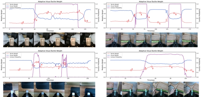 更具深远意义的是,模型学习到了可迁移的接触动态规律。如下图所示,模型能根据预测的接触状态自适应调整视觉与触觉的权重,并在不同物体和工具下保持稳定表现。这表明机器人正在从“执行动作”走向“理解物理接触”,逐步具备类似人类的预测与反馈协同能力。