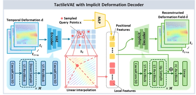 TactileVAE:通过时空联合编码与隐式函数解码,将高频、稠密的触觉3D形变压缩为低维连续潜变量表示,如下图所示。该模块不仅在空间上保留细粒度接触结构(如剪切、法向形变等),还在时间上建模触觉动态变化,从而有效刻画接触过程的演化轨迹。在显著降低数据维度与计算开销的同时,为后续预测与控制提可泛化的触觉表征,使机器人能够高效理解当前接触状态并快速响应环境变化。