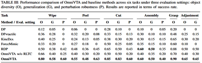 实验数据表明,OmniVTA视触觉操作框架在不同物体、不同接触模式下均取得了最优性能。在位置变化、工具变化和外界扰动等情境中,展现出了远超传统方法的鲁棒性和泛化能力。