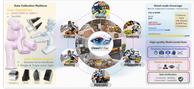 本次它石智航联合六大顶尖机构,从数据底座与技术框架双向攻坚。在数据层面上,团队发布了OmniViTac大规模视触觉数据集,如下图所示,为后续模型训练筑牢基础。