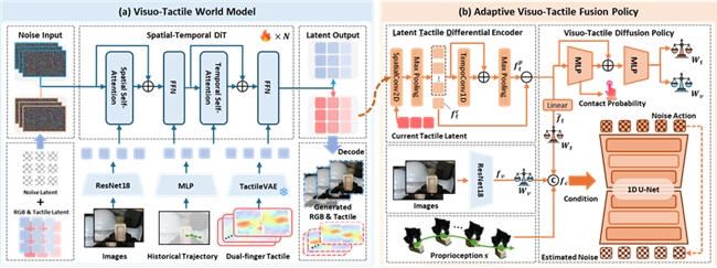 视触觉世界模型(预测模块):基于双流扩散生成架构,在共享条件约束下联合建模视觉与触觉的时序演化关系。视觉分支提供全局语义与几何先验,触觉分支聚焦局部接触动态,两者在潜空间中协同对齐,从而实现对未来触觉信号的高质量预测。通过显式建模“接触发生前—接触发生中—接触演化后”的动态过程,该模块使机器人能够提前预判接触趋势(如即将发生的接触、接触强度变化或滑动风险),为动作规划提供前瞻性信息支撑。