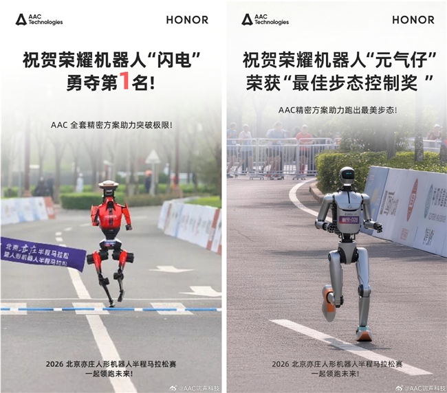 4月19日上午,2026北京亦庄人形机器人半程马拉松开跑。荣耀齐天大圣队、雷霆闪电队和星火燎原队所使用的人形机器人“闪电”,分别以50分26秒、50分56秒和53分01秒的成绩包揽前三;荣耀“元气仔”则凭借自然流畅的拟人化表现获得”最佳步态控制奖“。在这一成绩背后,荣耀的首选核心供应商瑞声科技(02018.HK)提供了关键助力。